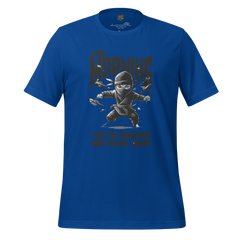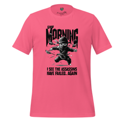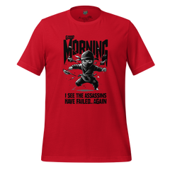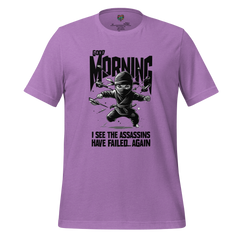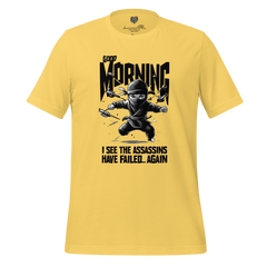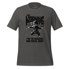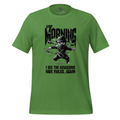 A dark humor greeting shirt featuring the line “Good morning, I see the assassins have failed.” Dry, absurd, and delightfully dramatic.
