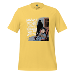 This romantic humor shirt captures the push-pull dynamic of desire and escape, pairing vintage lovers imagery with cheeky relationship wit. The phrase lands flirtatious rather than serious — affection framed through playful restraint and pursuit.