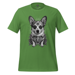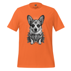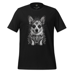 A decorative corgi sugar skull shirt blending Día de los Muertos symbolism with beloved dog charm. Ornate, joyful, and culturally inspired.