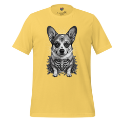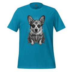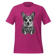 This Day of the Dead corgi shirt reimagines the cheerful, steadfast corgi through traditional sugar skull ornamentation, celebrating companionship that stays bright in memory. The calavera styling transforms familiar features into patterned tribute, merging folk symbolism with canine warmth.