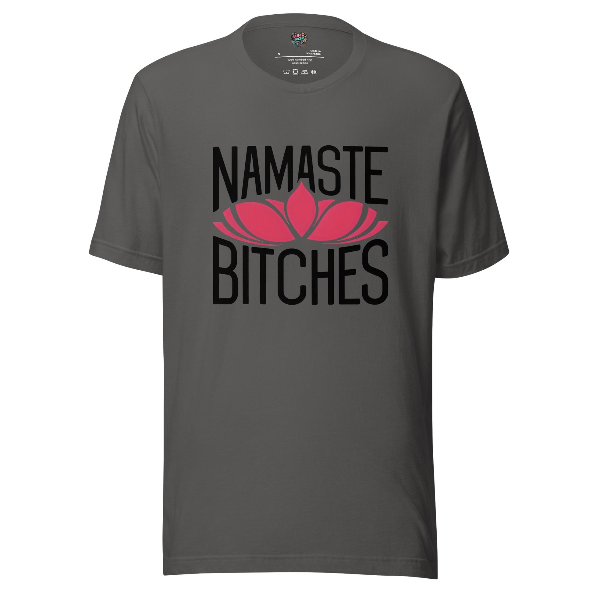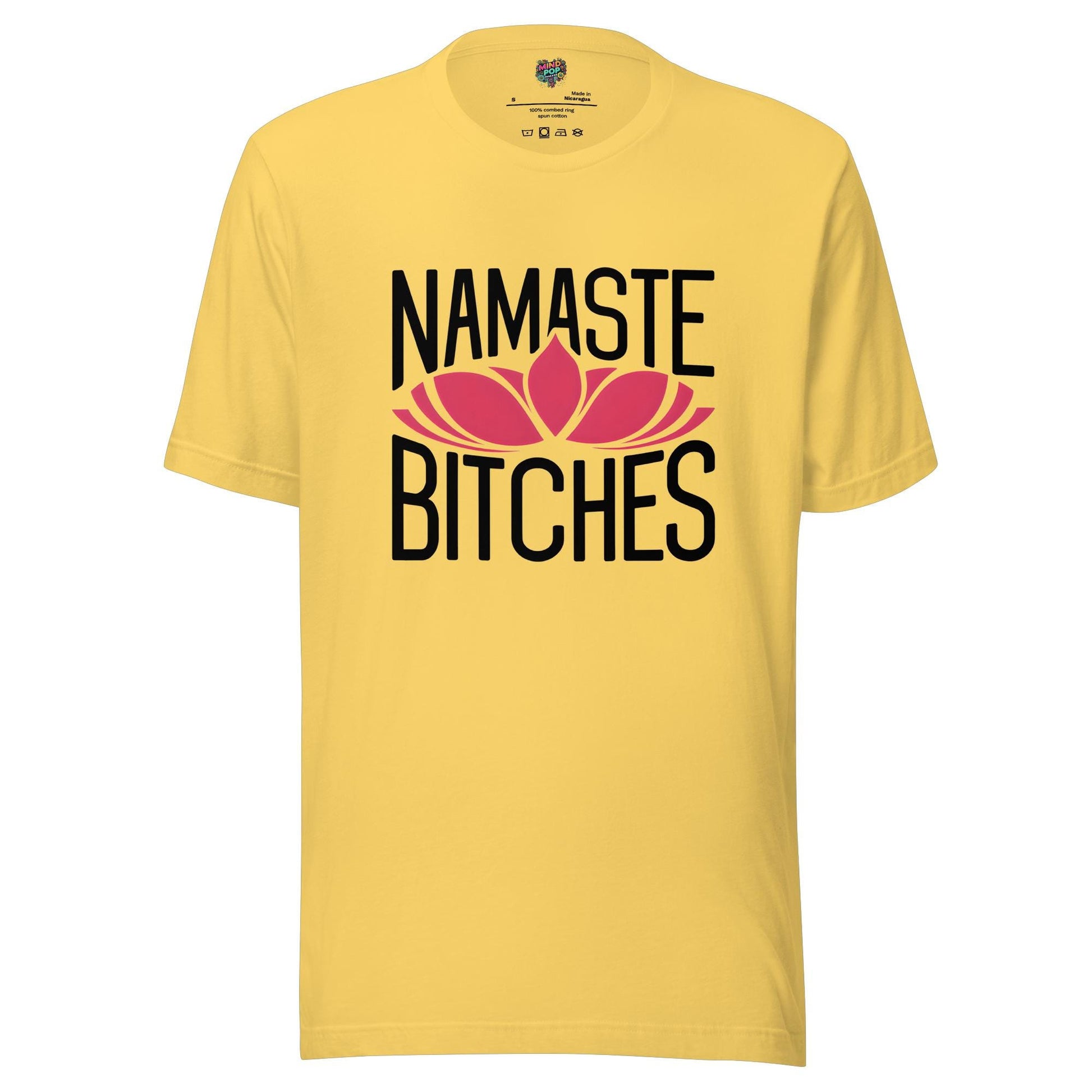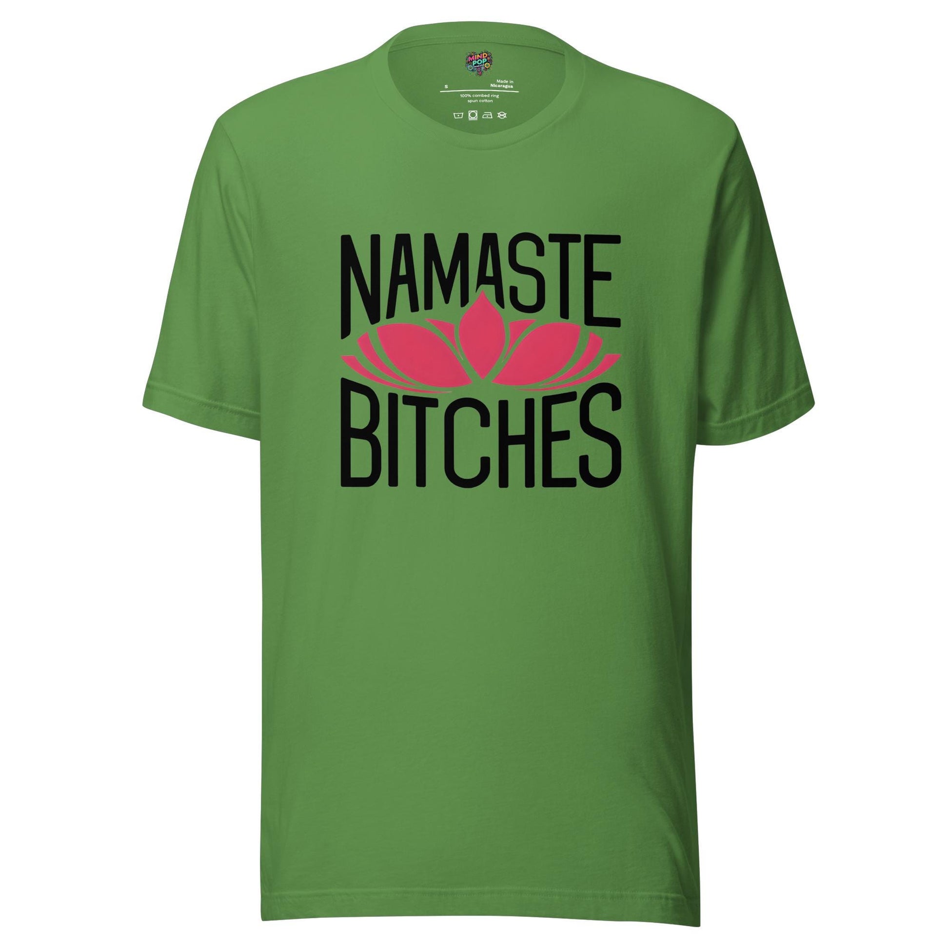 Front print featuring a lotus flower and the phrase “Namaste Bitches!” in bold, high-quality DTG inks that won’t fade—unlike your fleeting desire to do hot yoga twice a week.