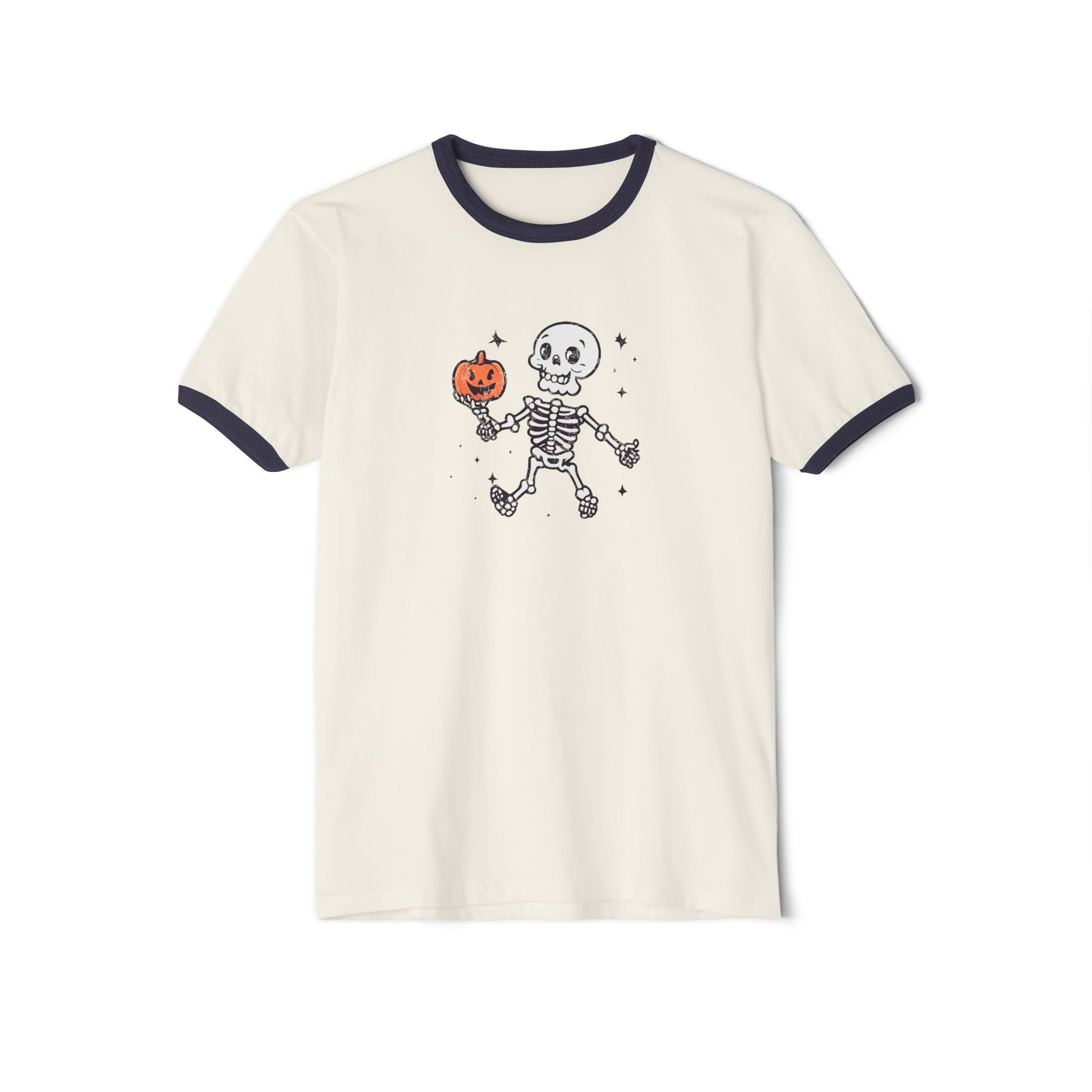 Design: Vintage-style skeleton Hamlet graphic on ringer T-shirt for spooky intellectuals and retro horror lovers